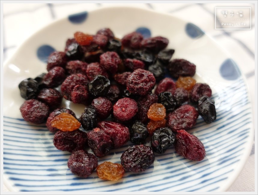 內含三種人氣莓果:葡萄乾、蔓越莓乾、藍莓乾,