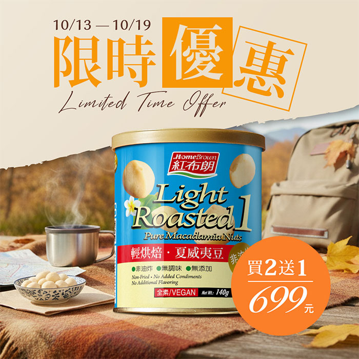 ⭐【紅布朗】輕烘焙夏威夷豆 買2送1:購買輕烘焙夏威夷豆 (140g) 兩罐 贈 輕烘焙夏威夷豆 (140g) 乙罐。